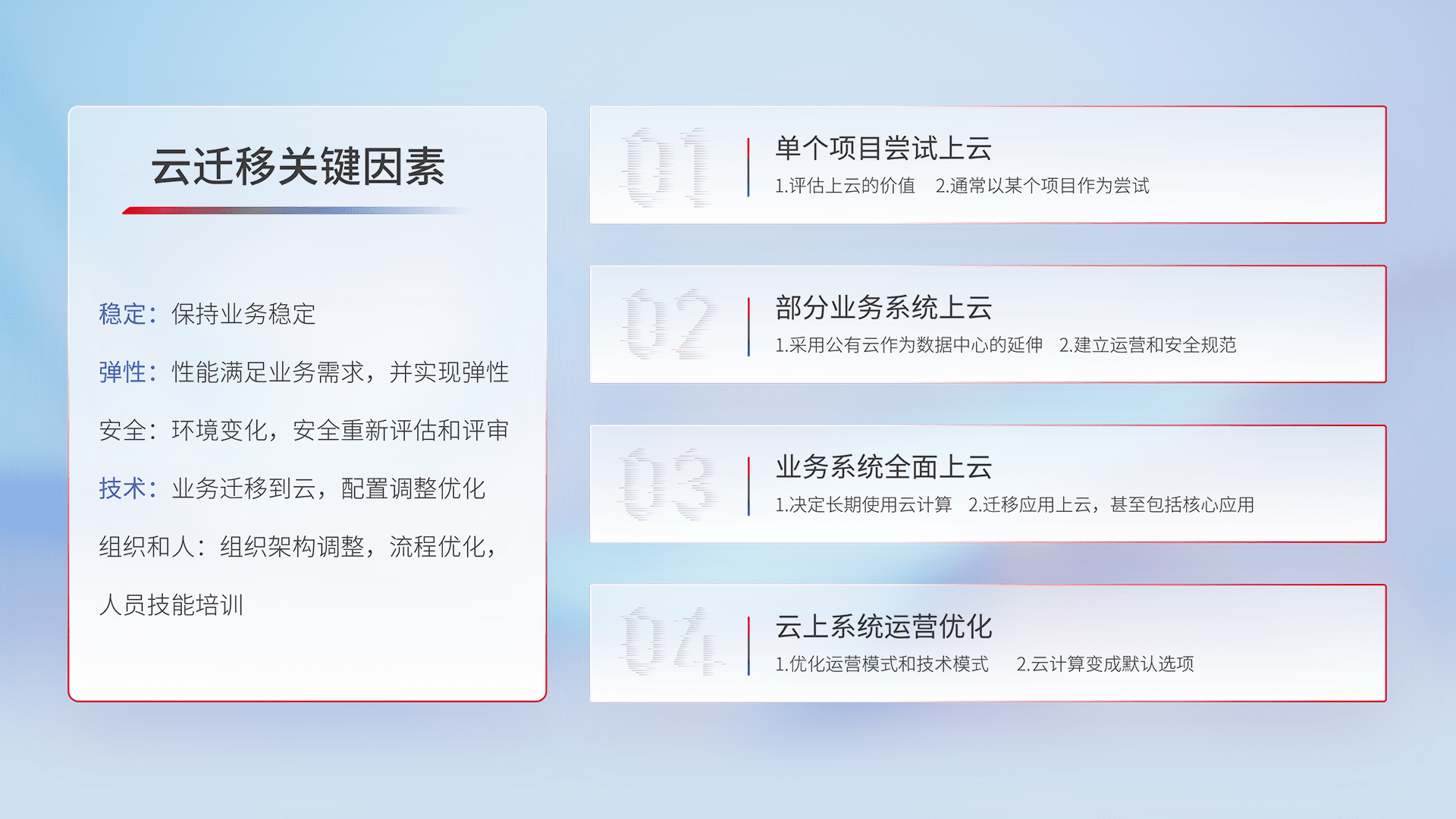 结合实际业务,,,,从规划设计、、云平台选型、、、云原生改造、、、数据迁移、、、、集成交付,,,迁移全过程为客户识别最佳上云路径,,做好风险识别管理,,,设计网络架构、、、、身份权限、、、、安全审计合规、、、、操作审计、、、、日志审计、、监控告警策略、、多站点容灾设计等,,,对云上基础设施进行整体规划,,,提升IT治理水平,,,以满足弹性、、高可用、、、、高性能的需求。。。
